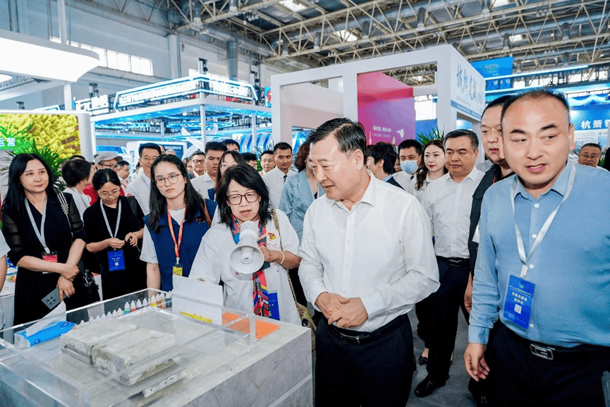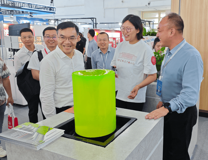 姜萬榮副部長參觀澎內(nèi)傳展臺,邊聽講解、邊認真觀看水池池壁裂縫自愈合實際應用效果。